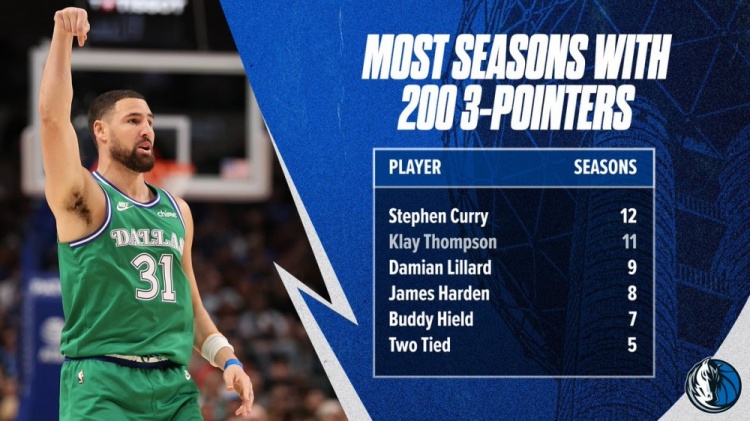 这样一来,克莱生涯已经有11个赛季三分球命中数超过200个,NBA历史上仅次于其前队友库里(12个赛季)。